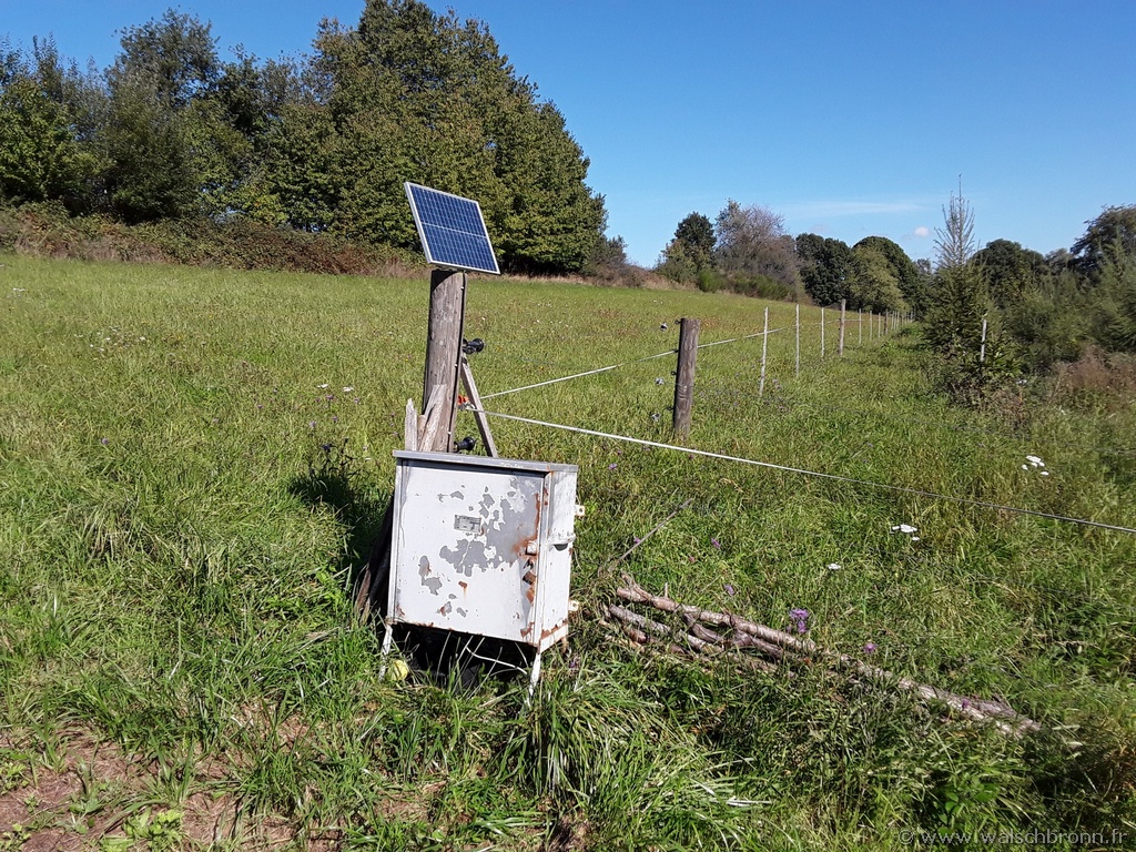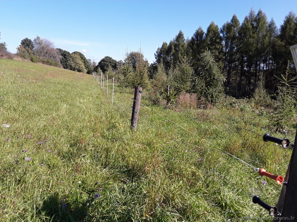 Pour éviter de mettre des protections individuelles aux plants, il a été opté pour une clôture électrique. Cette solution s'est avérée la moins chère et avec le temps, force est de constater qu'elle est efficace. Il s'agit d'une clôture électrique avec des piquets de 1,50m (similaires à ceux des enclos à chevaux) aidés de quelques poteaux en bois. Le tout est alimenté par un électrificateur solaire. Il a bien sûr fallu faire quelques dégagements mécanisés et manuels, ainsi que quelques regarnis